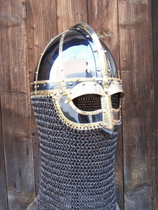 Basically a Vervelle is a rivet that fits through the metal of the helmet and the leather wrapped edge of the mail. The vervelle has a hole drilled in it that just sticks out past the surface of the leather and a cord goes through all the exposed ends to hold the drape on.